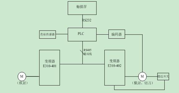 雙變頻立式包裝機由PLC+觸摸屏+2臺E310變頻器+編碼器+色標傳感器及繼電器組成電控系統(tǒng);溫控電路由智能型溫控表、固態(tài)繼電器、熱電偶元件等組成,控溫精確,顯示直觀,設定方便;機械部分包括包裝薄膜、初級導向輥筒、橡膠輥筒、導向輥筒、薄膜導向器、灌裝填充物、縱向熱封口輥筒、橫向熱封口輥筒、橫向冷卻封口輥筒、切口裝置、分袋切割裝置、成品輸出裝置等。